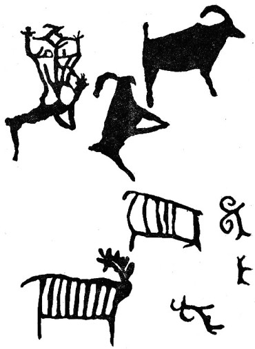 Рис. 16. Петроглифы эпохи энеолита с р. Чулуут (верхний ряд — козлы, средний — пятнистые быки, нижний — часть композиции «Вселенная»)