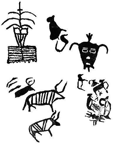 Итак, изображаемые неизменно в профиль мужские фигуры во всех описанных сценах показаны рядом с быками и другими копытными и над женскими фигурами (иногда рядом с ними), всегда в позе движения (с одной поднятой ногой). Изображенные в руках двух из этих фигур предметы, напоминающие бычьи хвосты, наводят на мысль, что на петроглифах энеолитичеекого времени с берегов Чулуута показан танец быка, исполнявшийся всегда мужчинами. Танцующие, бесспорно, связаны с женскими фигурами, расположенными рядом и символизирующими матерей-прародительниц. В связи с этим интересно описание танца буйвола у индейцев Америки: «Каждый индеец выносит из своего жилища специально имеющуюся на этот случай маску, сделанную из буйволовой головы, с рогами и хвостом, висящим сзади, И все принимаются плясать „буйвола". Десять или пятнадцать пляшущих образуют круг, барабаня при этом и стуча (56/57) трещотками, с песнями и завываниями. Когда один из них утомится, он начинает проделывать пантомиму, представляя, что его убили стрелой из лука и после снятия шкуры разрезали на части, между тем как другой, стоящий наготове со своей буйволиной толовой на плечах, занимает место выбывшего из пляски» [Тэйлор, 1939, с. 167].