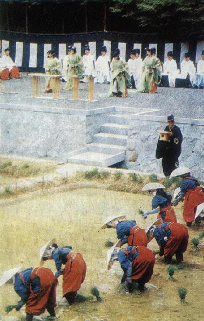 Ритуальная высадка рисовой рассады на священном поле при храме Фусими-инари дайся в г. Киото