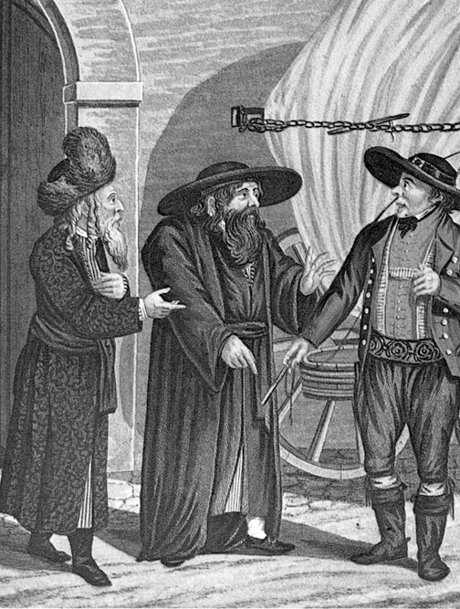 Надо сказать, что первоначально заезжим иудеям (жить в империи им не разрешалось) предписывалось под страхом сурового наказания носить как раз их «обыкновенную» национальную одежду. Согласно кодексу «Права, по которым судится Малороссийский народ…» (Глухов, 1743), «ежели жид или другой какой иноверный приехал в здешний край, в необыкновенном себе платье ходить будет, такова, призвав в суд, о том допросить и буди явится, но просто или за неимением обыкновенного своего платье такое носит, то ему приказать такового необыкновенного платья впредь не носить под штрафом денежным или под наказанием ареста». Власти сильно подозревали, что еврей, облачившись в несвойственное ему платье, делает это «для какого злоумышления, а особливо для шпионства». Впрочем, вид их производил на россиян самое забавное впечатление. «Странное их черное и по борту испещренное одеяние, смешные их скуфейки, и весь образ их имели в себе столь много странного и необыкновенного, что мы не могли довольно на них насмотреться», – живописал мемуарист Андрей Болотов. При этом одежда сынов Израиля была социально маркирована: «Евреи богатого круга носили в будни дорогие шерстяные ткани, а по субботам и праздникам шелковые кафтаны до пят с широким шелковым кушаком и высокие остроконечные собольи шапки; люди с более скромными средствами довольствовались в будни одеждой из домикотона, а праздничное платье делалось из дешевой шерстяной материи (так наз. «риделя»); бедные евреи одевались летом летом в полосатые (серые с синими полосками) нанковые кафтаны, а зимой в серое толстое сукно».