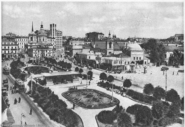 Через площадь проходила узкая и заполненная транспортом Тверская – уже тогда главная улица города.