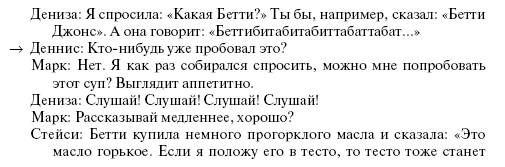 В примерах, приводимых в этом разделе, наложение – два одновременно звучащих голоса – не обязательно является перебиванием, то есть нарушением прав говорящего. В некоторых случаях говорящие искренне считают, что их права ущемлены и что их перебивают, даже когда наложения нет. Пример такого случая приводит Элис Гринвуд, анализируя общение трех своих детей (близнецов Денизы и Денниса двенадцати лет и одиннадцатилетней Стейси) и их друзей. В этом случае Дениза и Стейси разыграли для Марка, четырнадцатилетнего друга их брата, словесную сценку. Диалог, который Гринвуд называет «номер Бетти», сестры воспроизводят часто. Перед тем как начать, они привлекают внимание Марка: «Послушай это. Марк, послушай!» – говорит Дениза. Потом она и Деннис заявляют: «Это так смешно!» Но Марку это смешным не кажется: