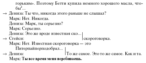 Больше всего поражает недовольство Марка: «Ты все время меня перебиваешь». Это особенно интересно по следующей причине: то, что говорил Марк, когда его перебили («Нет. Известная скороговорка– это Питерпайперподобрал…»), на самом деле прерывало объяснения девочек, хотя его голос и не наложился на их голоса. То же относится и к предыдущему высказыванию, когда они «перебили» его: в тот момент, когда Дениза, объявляя свой номер, сказала: «Хорошо, слушай», Марк начал спрашивать: «Это также смешно, как и…», но он не закончил, потому что Деннис засмеялся, а Дениза начала объявленный номер. Таким образом, возражение Марка оказывается воплощением в жизнь шутки: «Молчи, когда я тебя перебиваю».