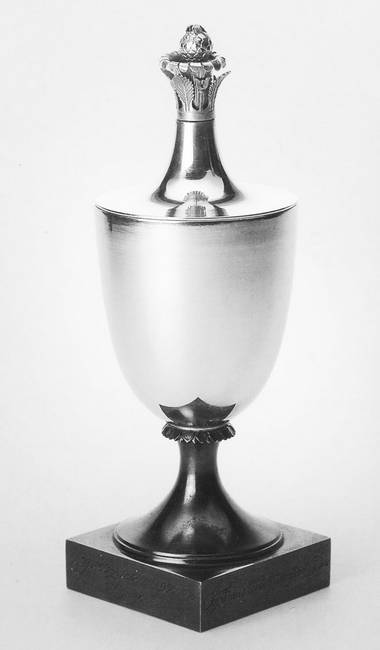 Чернильница. 1825 г. Платина, золото, сталь; чеканка, гравировка, полировка, воронение. Высота 17,5 см, диаметр чаши 6 см. ГЭ