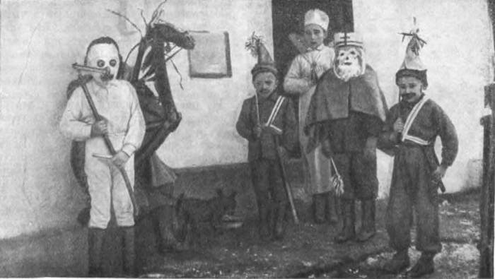 В словацких и чешских деревнях до сих пор еще на «Микулаша» выступают ряженые с масками зооморфными (конь, медведь, коза, ворон, аист) и антропоморфными (цыган, доктор, трубочист и др.). Вечером ходит «Микулаш» в длинном кожухе, с корзиной на спине, борода у него из шерсти и льна, на голове баранья шапка, в руках — палка. Микулаша сопровождает «ангел» в длинной белой рубахе, в конусообразной высокой шапке из картона. С ними ходит и «черт» в длинном кожухе, вывернутом мехом наружу. Через плечо у него перекинута цепь, на голове рожки из черной бумаги, в руках — колокольчик и метла. Микулаш приносит детям подарки, непослушным он оставляет розги или метлу. Если же не ждут Микулаша, родители и крестные сами кладут подарки детям в туфли, ставят их на окно, чтобы все видели эти подарки. В чешской Силезии Микулаш со своей дружиной обходит деревню в первое воскресенье декабря. Его дружина состоит из 15–20 ряженых. Микулаш одет ксендзом, в руках у него большая палица, его сопровождает дружка с венком на голове, женщина в чепце, «конь» (т. е. ряженый конем парень, его водят на цепи), три дьявола в вывернутых кожухах (ноги у них обмотаны соломой, на шее колокольчики), цыган с цыганкой, которые носят куклы из тряпья: «доктора», «смерти», «трубочиста», «полицейского». В каждом доме «конь» разливает воду на печке, доктор лечит водой зубы. Весь характер праздника Микулаша, значение которого забыто, говорит о том, что его происхождение связано с почитанием какого-то языческого божества, покровителя скотоводства. Недаром его сопровождали обычно маски козы, барана или коня, производящие магические действия, охраняющие от злых духов. Микулаш с дружиной не только дарил, но и принимал подарки, что было, по-видимому, пережитком древнего жертвоприношения.[584]