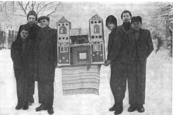 Из цветной бумаги, фольги и дерева в польских, чешских, и словацких городах и деревнях издавна мастерили вертепы — шопки (польск.), бетлемы (чешск., словацк.).[709] Они произошли от яселек, которые первоначально устраивали в костелах. К рождеству на алтаре или в боковой часовне костела сооружали Вифлеемский хлев. На фоне, изображающем скалы, покрытые южной растительностью, помещали ясельки с фигуркой новорожденного Христа, фигурки божьей матери, св. Иосифа, пастухов, овец и др. К празднику трех королей здесь же ставили фигурки восточных владык, пришедших поклониться Христу. Они несли ему дары — мирру, фимиам и золото. Обычай устраивать в костелах ясельки распространился из Италии в XIII в. Его принесли монахи-францисканцы. В конце XVII в. для привлечения зрителей на свои представления монахи вводят в них жанровые сценки, в вертепах появляются движущиеся фигурки (по-видимому, под влиянием французского театра марионеток). Постепенно представление это принимает все более народный характер, религиозный сюжет служит в нем только канвой. В конце XVIII в. духовными властями такие представления в костелах были запрещены, как не соответствующие по содержанию святости костелов. Тогда вертепы распространились в быту, с ними стали ходить по домам и давать представления — «колядовать».