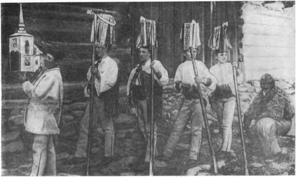 Если у чехов и словаков св. Николай (Микулаш) приходил и приносил детям подарки в день св. Микулаша, то у поляков он появлялся с той же целью в рождественский сочельник.[602] В этот же день в Польше ходили по домам Юзеф в сопровождении божьего дитяти (Силезия),[603] или гвяздоров (gwiazdory). например, в Познаньском воеводстве.[604] Юзеф и гвяздоры были в вывороченных мехом наружу кожухах, опоясаны соломенными перевяслами и цепями, в больших меховых или бумажных шапках. Нередко они были в масках или с лицами, вымазанными сажей. О своем прибытии они возвещали стуком в дверь и звоном колокольчиков, привязанных у гвяздоров к сапогам. Ходила еще и гвяздка (мужчина или женщина), одетая в белое платье.