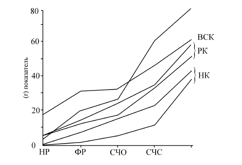 Диаграмма 8.1. Социальная стратификация лингвистической переменной в процессе изменения – вокализованный [г] Нью-Йорка [Labov 1972а, 114].