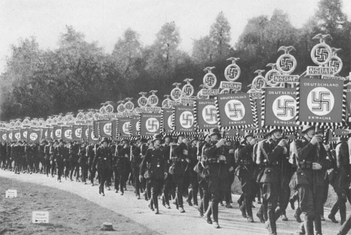 Еще в 1933 году Гитлер провозглашал свои планы борьбы против условий Версаля при помощи, сначала, осторожной внешней политики, чтобы затем, собрав силы, перейти к «завоеванию нового жизненного пространства на Востоке и его беспощадной германизации»[109]. Фюрер был сконцентрирован на своей миссии отразить смертельную угрозу Европе и арийской расе, а также хотел создать с этой целью «непобедимую мировую империю»[110]. Как партия послужила Гитлеру орудием завоевания власти, так и Германия должна была стать теперь инструментом для того, чтобы «открыть дверь к прочному господству над миром»[111].