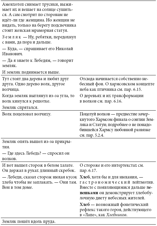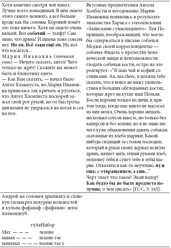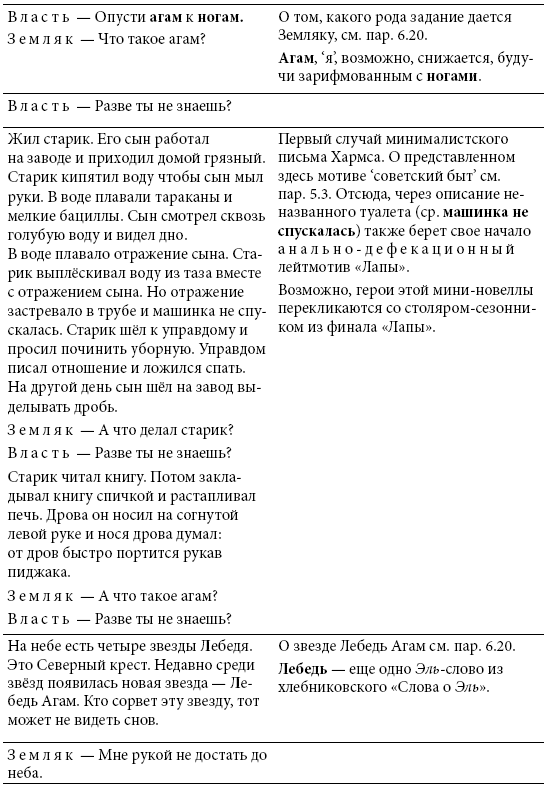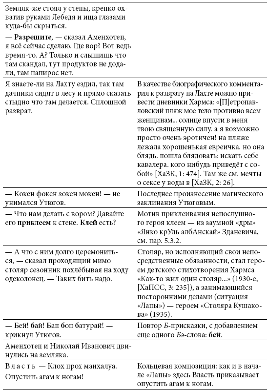 Текст «Лапы» приводится в левом столбике в редакции Сажина, сохранившей авторскую орфографию, по изданию [ХаПСС, 1: 128–145], с указанием разночтений по изданию Мейлаха [Хармс 1999: 312–334], которые берутся в угловые скобки. Правый столбец занимает комментарий структурного, интертекстуального и лингвопоэтического характера.