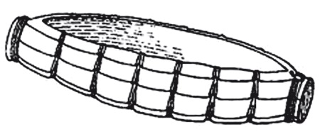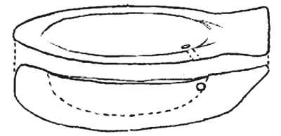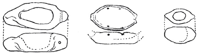Эти предметы как формой, так и орнаментом весьма напоминает герзейская (S. D. 52) глиняная лодочка из Нагады, с той разницей, что она меньше их в среднем примерно вдвое[53], а в ее роспись по обеим стенкам добавлены стоящие в ряд фигурки гребцов с веслами в руках (рис. 57) [367]. Питри приводил и более позднюю, архаическую версию «модели» папирусного судна якобы с фальшбортами из стебельных связок: алебастровое изделие в форме «удивительнейшей тростниковой корзины», найденное им разбитым на куски в раннединастическом царском некрополе Абидоса, которое он относил к разряду «каменных ваз» [357] и называл «закрытым плотом с огороженными сторонами» (рис. 58) [363]. Видный американский археолог-египтолог Джордж Рейзнер, однако, считал подобную интерпретацию, без ее поверки дополнительными аналогичными материалами, «очень сомнительной» [384].