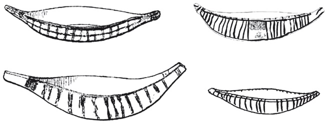 Лодки близкого типа как будто бы представлены несколькими керамическими «моделями» раннего амратского периода (S. D. 32–36) из раскопов Нагады и малого Диосполя [355; 361; 367]. В отличие от их мелких и неопределенно-«слепых» бадарийских предшественников, эти изделия длиной до и более полуметра достаточно четко сформованы, даже стандартизированы, а снаружи разрисованы специфическим полосчатым или сетчатым орнаментом, словно передающим некую фактуру (рис. 56), на основании чего исследователи пытались судить о материальных и конструктивных особенностях не дошедших до нас оригиналов. Так, Флиндерс Питри, открывший амратские «лодочные реплики», поначалу не допускал и мысли о папирусе ввиду их тонких и высоких бортиков, которые в натуральном вязаночном исполнении, на его взгляд, не выдержали бы «давления воды»; при этом он отвергал в вероятной реальности также деревянные долбленки из цельных заготовок, поскольку линиями орнамента на «моделях» «ясно показаны составные части» корпусов; но и доски в качестве судовых деталей он признать не решался, на первых порах резюмируя, что в данном случае «материал неочевиден» [360]. Позже Питри без «лишних» оговорок и аргументов будет утверждать, что такие «модели» воспроизводят все же папирусную конструкцию «со сборными бортами из вертикально скрепленных вязанок» [365].