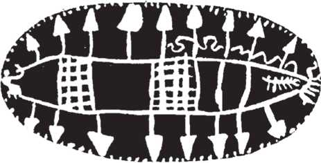 Так, на внутренней поверхности овального блюда «из Махасны» [316] показано в плане «судно, обычное для более поздней декорированной керамики», продолговатое и заостряющееся к носу и корме наподобие ладьи Хеопса, имеющее семнадцать весел по всему периметру бортов, две каюты с решетчатыми (вероятно, растительного плетения) крышами, сидящего с поднятой рукой кормчего и ветвь какого-то дерева на носу якобы «для укрытия в ее тени впередсмотрящего» (рис. 60) [360]. По убеждению Питри, аналогичная лодка с гребными веслами в ряд, двумя каютами и т. п. изображена в профиль на уже известной нам круглой тарелке из Каирского музея (рис. 17) [360]. Однако, возвращаясь к сказанному в предыдущей главе, столь разительное общее сходство этих рисунков с «классическим» ладейным образом Нагады Пс неизбежно ставит под вопрос надежность и «неприкосновенность» относительной датировки обоих сосудов раннеамратским периодом.