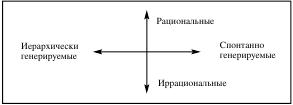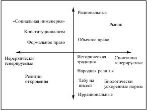 Континуум, простирающийся от иерархически генерированных норм до спонтанно генерированных, можно дополнить еще одним. Он будет включать в себя, с одной стороны, нормы, которые родились в результате рационального выбора, а с другой стороны — унаследованные обществом от предков и по сути своей иррациональные. Наложение двух этих осей друг на друга создает матрицу, объемлющую все возможные типы норм и представленную на Диаграмме 2. Использование нами термина «рациональный» в данном контексте означает лишь то, что альтернативные нормы на сознательном уровне никогда не обсуждались и появились очень давно. Разумеется, рациональные решения не всегда бывают правильными, что не идет на пользу людям, их принимающим. В то же время иррациональные нормы вполне способны быть весьма функциональными, как это имеет место в отношении религиозных верований, поддерживающих социальную стабильность или экономический прогресс.