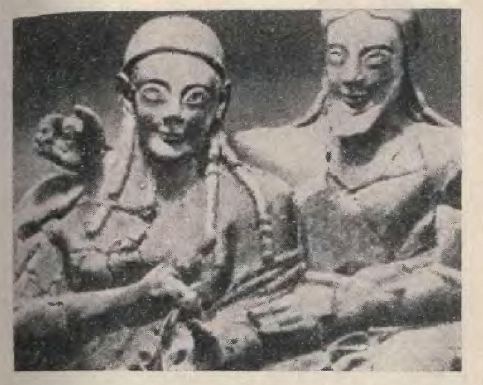 На них часто изображалось путешествие в подземное царство. Усопший отправляется туда пешком, верхом или на колеснице, иногда на руках крылатого гения. А какова сама загробная жизнь? На некоторых картинах эта жизнь изображена полной радости, веселья и гармонии; умершие участвуют в богатых пиршествах, устроенных в их честь, во время которых все присутствующие наслаждаются музыкой и танцами. На других фресках мы видим богов подземного царства из греческой мифологии — Аида с волчьей шкурой на голове, которого этруски называли Аита или Эита, и Персефону, по-этрусски Персипуай. Главным сюжетом этих фресок также является трапеза, но проходит она в совсем другой обстановке. Лица демонов, прислужников бога мрачного подземного царства, не выражают мира и спокойствия, как бы излучаехмых персонажами предыдущих фресок. Эти демонические существа, порожденные представлениями самих этрусков, внушают страх. Таков, например, Харун, хотя и названный как Харон — у греков мифический перевозчик через реку Стикс[60], — но не имеющий со своим греческим прототипом ничего общего, кроме имени. Крючковатый нос, оскаленный рот и синее, словно гниющее, тело производят отталкивающее впечатление получеловека, полузверя. Другой, уже чисто этрусский, демон — Тухулха в своем безобразии не уступает Харуну. Лошадиные уши и нос, напоминающий клюв грифа, обезображивают лицо, крылья нетопыря, подымающиеся над его головой и обвивающие талию и ноги, дополняют образ.