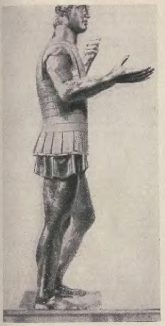Имя высшего этрусского божества — Тин или Тиния выгравировано на зеркалах, изображено на посуде, оно известно также по модели овечьей печени, найденной в Плаценции, но о ней мы еще будем говорить впереди. Не совсем ясно, как этруски его себе представляли. Правда, найдены бронзовые статуэтки, самые ранние из которых относятся к V веку до н. э., похожие на изображения высшего греческого божества Дия, но другие сохранившиеся фигурки с молниями совсем не похожи на греческого громовержца Дия или римского Юпитера. На зеркалах Тин также изображен то как Зевс, то как юноша, не имеющий ни малейшего сходства с Дием, и лишь надпись «Тиния» не позволяет принять этого молодого бога за Аплу (этрусская модификация греческого Аполлона) или за другое божество. Этрускологи до сих пор не могут дать удовлетворительного объяснения этому эклектизму в представлении о богах, совершенно несвойственному грекам и римлянам.