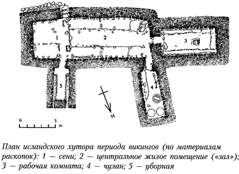 Естественная среда, в которой жили скандинавы, определяла не только формы их хозяйственной деятельности, но и характер поселений. В гористых, сильно пересеченных местностях Норвегии и Швеции преобладали хуторские поселения, состоявшие из отдельной усадьбы или нескольких усадеб. Зачастую хутора были разбросаны на большом расстоянии один от другого. Лишь постепенно, с ростом населения, из хуторов возникали небольшие деревни. Но и тогда сыновьям владельца хутора нередко приходилось переселяться в другую местность, если имелась возможность основать новую усадьбу. Обширные районы в гористой части Скандинавии оставались незаселенными и использовались только для охоты. И в наши дни Норвегия отличается наименьшей плотностью населения в Европе, уступая в этом отношении одной Исландии. В равнинных областях средней Швеции и в Дании деревенская община возникла уже в раннее средневековье. Здесь население гуще. В этих областях, да еще кое-где в приморских районах Норвегии быстрее наступал материальный прогресс, развивалась культура, закладывались предпосылки для возникновения государства.