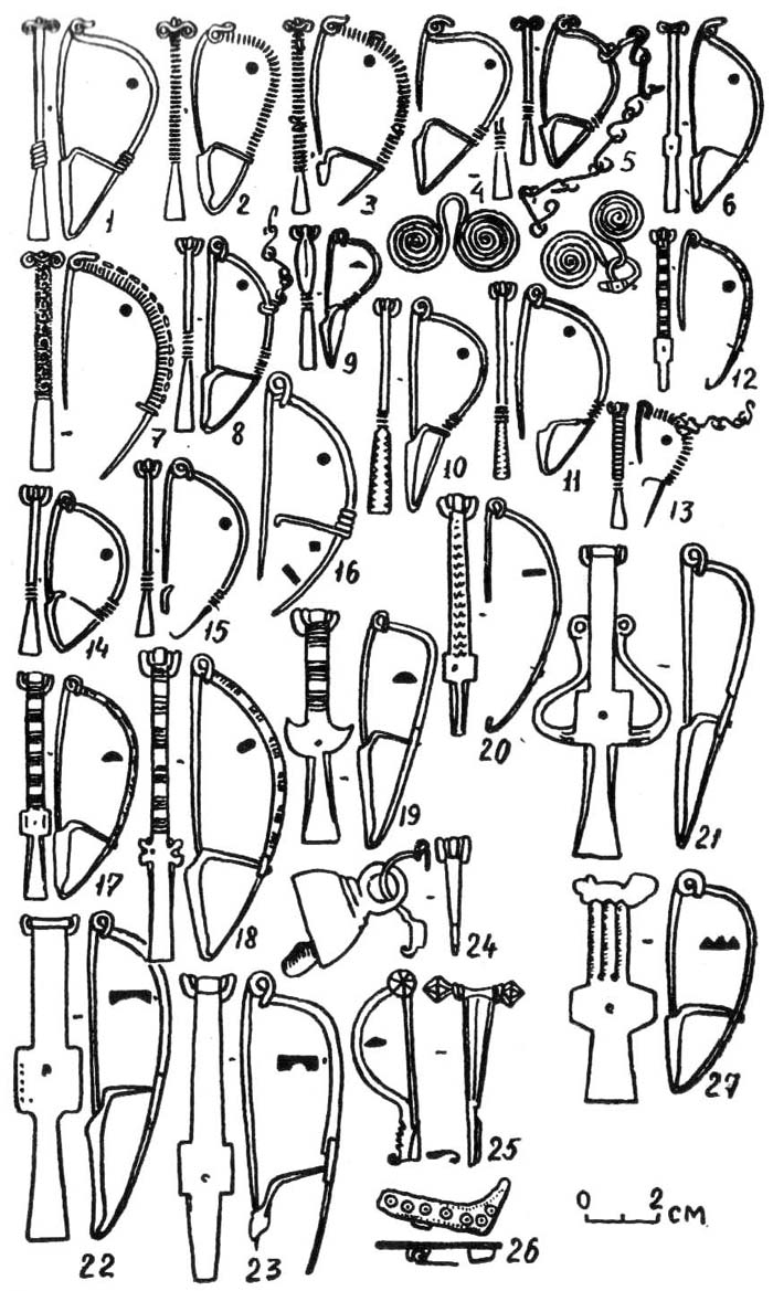 Металлические застежки — фибулы — играли важную роль в костюме древних цебельдинцев. Первые образцы их были заимствованы из Северного Причерноморья, возможно, из античных городов. Это были простые проволочные подвязные фибулы, сделанные из одного куска нетолстой проволоки. И носили их в Цебельде так же, как в Северном Причерноморье — по одной или две. Самые ранние находки датируются второй половиной II в. н. э. В то же время в Западной [119] Грузии (Клдеети, Бори, Чхороцку) появилось местное производство подвязных фибул. От крымских образцов они отличались более четким дуговидным корпусом. Возможно, прав М. М. Трапш, предполагая в этом влияние местной кобанской традиции. В начале III в. дуговидные подвязные фибулы появились и в Цебельдинской долине. [120] Началась выработка местных цебельдинских фибул. Они украшались проволочной обмоткой иногда с петельками. И носили их уже по иному — до пяти штук в комплекте.