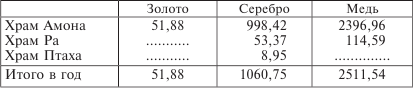 Ежегодный доход, поступавший в храмы через налоги, входил в две перечисленные выше категории. Доход с полей измерялся в мерах зерна, «зерно из податей крестьян» и прочие поступления, будь то в виде товаров или услуг, измерялись в мерах серебра, «серебро, имуществом и работой, передано в качестве подношений богам». Преимущество доли Амона видно из того факта, что его храм получал 86 процентов от ежегодных податей серебром, храм Ра – 11 процентов, храм Птаха – 3 процентов и ни одного процента не направлялось более мелким храмам. Доля зерна для храма Амона составляла 62 процента, храма Ра – 15 процентов, храма Птаха – 8 и 15 процентов более мелким храмам. Мы не имеем представления, как доходы храмов соотносились с доходами государства, однако ежегодный доход в виде 373 килограммов серебра и 40 010 кубических метров зерна должен был составлять значительную часть экономики страны. В собственности храмов находились 169 городов, девять из которых располагались в Сирии, более 500 садов, виноградников и фруктовых садов, более 50 судоверфей и 88 кораблей, около полумиллиона голов скота и т. д.