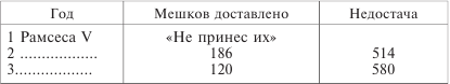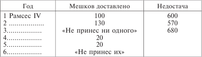 При Рамсесе XI некий Тутмос был управляющим Великим некрополем. В числе прочих функций он был обязан объезжать Верхний Египет и собирать налоги зерном, часть которых предназначалась для выплат рабочим. В одном разделе его письма говорится: «Направь своих чиновников (?) и управляющих некрополем Иуфенамона и стража Тутмоса или стража Хонсумеса. Поторопи их собрать зерно, чтобы не дать людям голодать и не выполнять работу свою в доме фараона, осыпая тебя [упреками]»[340]. Было ли это гуманностью? Другой документ намекает на уменьшение веса при перевозке собранного зерна перед тем, как оно было передано на хранение в Фивы. Управляющий некрополем Тутмос и его помощники отправились на юг, в Эсне, чтобы собрать подати. Полученное им через храм в том городе равнялось 342,25 мешка[341]. Однако 6,25 мешка было сразу же отдано Эсне «на издержки». Когда лодка прибыла в Фивы, управляющий Западными Фивами, Паураа, принял только 314 мешков. Различные удержания в счет «издержек» и «довольства» были отданы разным участникам поездки, однако записи составлены так, что после суммирования по-прежнему остается некоторое количество неучтенного зерна. Довольно очевидно, что счет был подделан и что Тутмос был уверен в своей безнаказанности[342].
