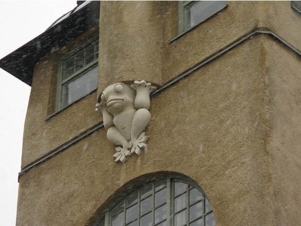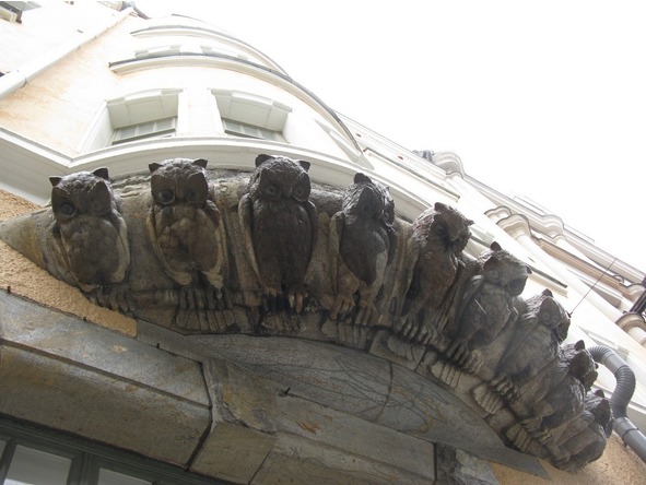 По-своему выразителен и фрагмент декора в доходном доме на улице Круунувуоренкату (№3), спроектированного в мастерской талантливого зодчего Георга Васашерна. Под нависающим козырьком входного портала будто спрятался целый «выводок сов». Фигурки, не любящих дневного света птиц, словно одержимые природным чувством, нашли для себя приятное местечко в тени.