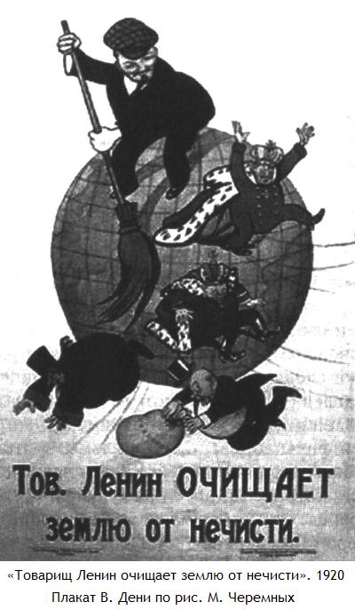 В общественно-политических контекстах советской поры метафоры «нечисти» закрепляются первоначально за представителями старорежимного прошлого. Среди ранних примеров такого словоупотребления — плакат Виктора Дени по рисунку Михаила Черемных «Товарищ Ленин очищает землю от нечисти» (1920), добродушно изображающий улыбающегося вождя революции, стоящего на земном шаре и выметающего метлой царя, попа и банкира[261].
