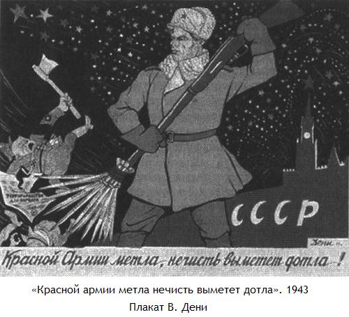 Военные годы привносят в общественно-политическое красноречие словосочетание «фашистская нечисть» (так, например, в знаменитой песне на слова Василия Лебедева-Кумача и музыку Александра Александрова: «Вставай, страна огромная, вставай на смертный бой с фашистской силой темною, с проклятою ордой. Гнилой фашистской нечисти загоним пулю в лоб, отребью человечества сколотим крепкий гроб!»)[266]. В 1943 году визуальным выражением такой образности станет антифашистский плакат уже упоминавшегося Виктора Дени (автора плаката «товарищ Ленин очищает землю от нечисти»): на этот раз «Красной армии метла нечисть выметет дотла».