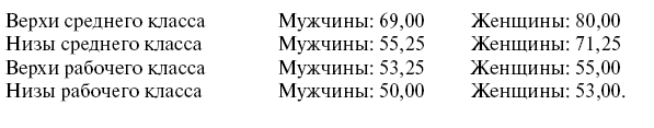 Макаулэй обнаружил, например, в своем исследовании социальной стратификации [i] в Глазго, что женщины низов среднего класса чаще употребляют стандартное произношение [?], чем мужчины верхов среднего класса. [??] считается «просторечным» (vernacular) произношением (просторечное = нестандартное). Макаулэй приводит следующие «показатели мужчин и женщин для [i]» в Глазго [Macaulay 1978, 135]: