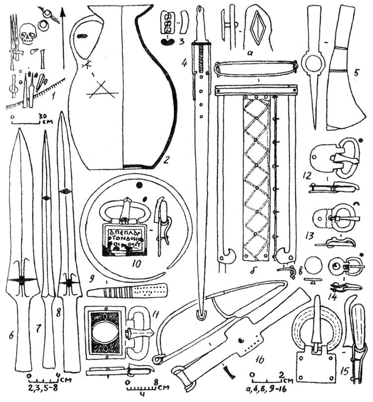 Рис. 22. План (1) и инвентарь погребения с импортной пряжкой с греческой надписью (Лар): 2 — 3 — керамика, 4 — железный меч (а, б, в — серебряные детали ножен меча), 6-8 — железные наконечники копий, 9 — бронзовый браслет, 10-11 — бронзовые пряжки, 12-15 — серебряные пряжки, 16 — бронзовая фибула.