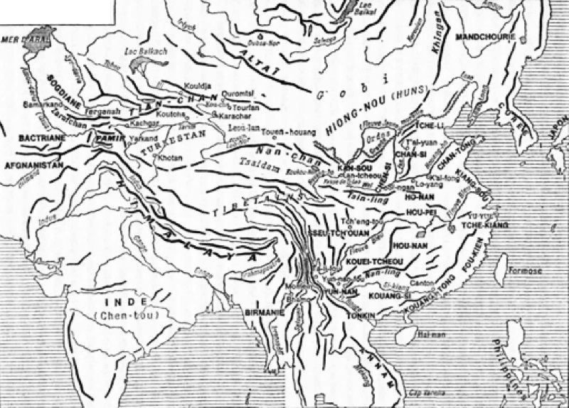 На юге Китай вышел к морю, где возникла огромная граница. В 215 г. император, инспектировавший Чжили, продвинулся к северу до гор, охватывавших с северной стороны эту область. Именно там государство Янь после своей победы над гуннами соорудило длинную стену. Ши Хуанди, еще в 219 г. отправивший в южные моря разведчиков из уроженцев Ци в Шаньдуне, в 215 г. послал новых, которые были уроженцами Чжили. Может быть, он имел виды на Корею, а не только на таинственные острова? В любом случае он набрасывал планы морской политики. Но его непосредственные заботы были связаны со степью. Именно в 215 г. во время своей поездки в Чжили он решил соединить между собой отрезки длинной стены в великую единую стену, которая оборонила бы Китай от гуннов. В том же году он приказал генералу Мэн Тяню предпринять крупное военное наступление в излучине Хуанхэ. Мэн Тянь смог на самом деле отбросить варваров дальше на север от Хуанхэ. В 214 г. он переправился через реку и приступил к сооружению восточного отрезка Великой стены. Для проведения работ и заселения края император направил ему целое племя заключенных. Защищенная стеной северная граница Китая протянулась от реки Ляо до области Линьтао на северо-западе Ганьсу. В результате Китай оказался в контакте не с мелкими и разрозненными племенами жунов, мань и мэ, как раньше, а с крупными кочевыми народами, которых китайцы называли ху или сюнну, хунну. Это случилось точно в самом конце третьего столетия, когда хунну образовали «в первый раз объединенную и сильную нацию». Мы менее осведомлены относительно политики, проводимой императором на западе, в стороне гор. Но и там, в области Цзянчжун, на юго-запад от Линьтао, был установлен контакт с сильными и могущественными народностями: действительно, в те времена тибетские племена населяли горные долины верховий Желтой реки. Территории страны при Ши Хуанди примерно распространялись на то, что должно было стать Китаем восемнадцати провинций. Считают, что иностранцы назвали Китай (Chine) по имени династии Цинь. Основатель этой династии действительно наделил Китай его традиционными пределами. С каждой стороны он установил отношения с великими цивилизациями или с великими народами.