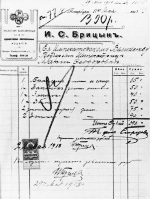 Счёт за изделия И.С. Брицына, купленные императрицей Марией Феодоровной