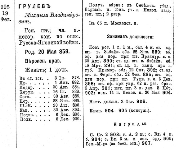 После заключения мира с Японией увенчанный наградами Грулёв получает лестное предложение занять место первого заместителя начальника Генерального штаба, но отказывается. «После всего пережитого в… войне, – пояснил он, – после всего, что творилось в России после войны, у меня раскрылись глаза… От предложенной мне высокой должности я отказался под предлогом служить в строю».