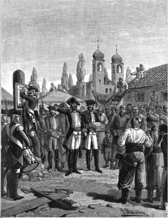Объявление генералом Кречетниковым о присоединении Волыни и Подолии в 1793 г. Рисунок Р. Штейна по гравюре Шюблера