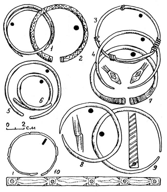 Древнейшие образцы этих украшений связаны с комплексами II — первой половины III в. Это круглопроволочные, в полтора оборота браслеты с концами, имеющими фаллическое оформление; круглопроволочные браслеты с обрубленными концами, украшенными сеткой гравированных линий и кружочками; круглопроволочные гладкие, с уплощенными концами, пластинчатые, в полтора — два оборота. В III— первой половине VI в. были распространены круглопроволочные браслеты с заходящими концами, с концами, оформленными в виде змеиных головок; браслеты с двойной [124] перевязкой. Во второй половине IV в. остаются круглопроволочные браслеты с рублеными концами, оформлявшимися иногда гравированным узором. В V в. наряду с этими браслетами изредка встречаются экземпляры со змеиными головками, фаллическими окончаниями и т. д. В VI в. распространяются круглопроволочные браслеты с уплощенными концами, украшавшимися рядами точечной насечки. В VII в. наряду с ними используются круглопроволочные браслеты, массивные, с обрубленными концами, оформленными круговыми бороздами, пластинчатые, с нечетным числом прямоугольных утолщений с ямкой в центре, орнаментированные точечными дорожками [17, 190; 18; 53, 189-191; 61, 57-59].