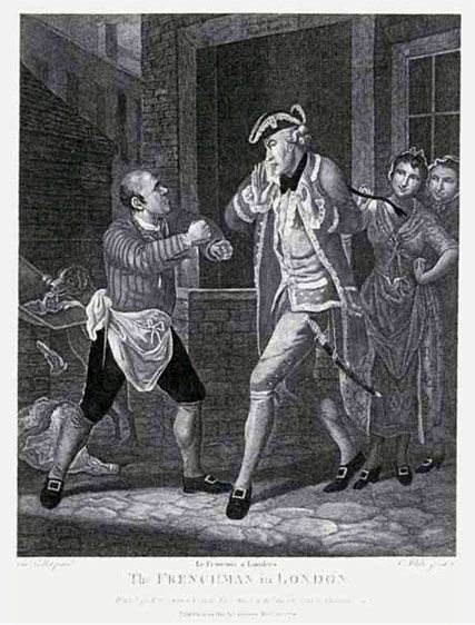 Хотя лондонцы обожали парижский стиль в одежде и всячески его копировали, в 1780-е годы парижане, появлявшиеся на улицах Лондона в модной одежде, действительно часто подвергались насмешкам и прямым нападкам, причем не только потому, что Франция воевала на стороне колонистов-повстанцев, именовавших себя Соединенными Штатами. Многие парижане откровенно боялись ездить в Лондон. Мерсье пишет, что в Париже «повсеместно считают, что француз не сможет перейти на другую сторону улицы, не будучи ошиканным, и что все англичане как один отличаются необыкновенной свирепостью и питаются сырым мясом». Кстати, сами лондонцы тоже поддерживали этот стереотип, публикуя в своих журналах гравюры подобные нижеприведенному «Французу в Лондоне» (1770) [рис. 3]. Изящно одетый парижанин, в тщетной попытке беспрепятственно пройти по лондонской улице, попал «в клещи»: спереди его атакует возбужденный мясник (о чем говорит большое количество сырого мяса на полу), а сзади одна из женщин шутливо дергает за косичку модного парика. По-видимому, женщины при этом обмениваются нелестными намеками относительно сходства этой косички с обезьяньим хвостом, или, что еще более обидно, с определенной частью тела самого француза. То, что эта гравюра была сделана в Лондоне, говорит само за себя: видимо, англичанам импонировала репутация драчунов и забияк. Действительно, на гравюре мясник в засаленном фартуке выглядит гораздо более мужественным, чем перепуганный, тонконогий француз с его бесполезной сабелькой и камзолом из тонкого шелка, украшенным золотым шитьем.