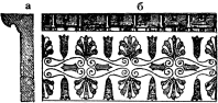 На этой плите лежит антаблемент, приближающийся по художественной отделке к древнеионическому, но с той разницей, что его фриз гуще покрыт пластическими украшениями и над карнизом, разбитым с нижней стороны на кронштейны, идут также украшения в виде пальметт и других фигур.