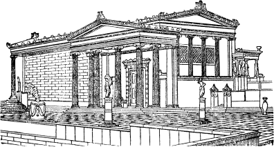 Соединяя в себе, как полагают, святилище Эрехтея и храм Паллады Полии, он представляет собой прекрасный пример умения греков объединять несколько храмов в одном здании. Кроме того, он демонстрирует нам изящное применение цельных статуй (кариатид) вместо настоящих колонн (рис. 89).