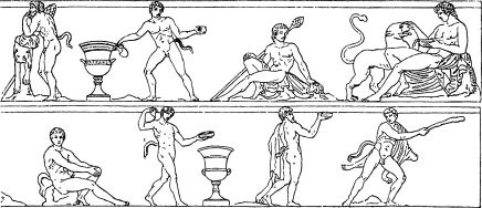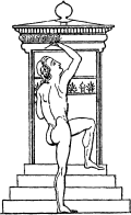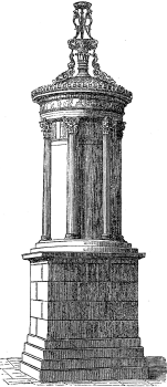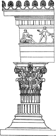 К персонифицированным памятникам относятся так называемые хореические памятники, среди которых главное место как по своему значению, так и по цельности занимают памятники Лизикрата (рис. 93, 94 — барельеф на памятнике Лисикрата) и Фрасилла. Первый, поставленный в 334 г. до н. э., при высоте 34 фута имеет вид простого грота, обрамленного дорическими пилястрами и фризом, с рельефным изображением на нем победных венков. Другие подобные памятники (сохранившиеся в рассеянных обломках) были просто колоннами ионического или коринфского ордера на подножии в несколько ступеней и служили для установки на них полученного приза.