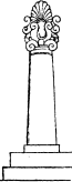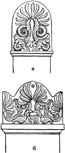 Простейшими из этих памятников были столбы или колонны с надписью на стержне и скульптурными украшениями наверху — круглыми на колоннах и рельефными на столбах (рис. 91; рис. 92, а, б). Иногда столбы заменялись поставленными вертикально каменными плитами с рельефной фигурой самого умершего или с каким-нибудь символическим изображением. Например, на памятнике холостого почти всегда изображали фигуру женщины, несущей воду, и т. п. На больших надгробных плитах надстраивали также фронтоны (рис. 95), а гробницы с внутренним помещением даже украшали фасадом, подобным храмовому.