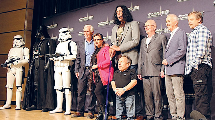 Актерский ансамбль «Возвращения Джедая» воссоединился на сцене за несколько месяцев до объявления о том, что четверо из них вернутся к своим ролям в «Эпизоде VII». На тот момент, до своей операции, один из актеров, Питер Мейхью (Чубакка), не мог ходить без трости в форме светового меча.