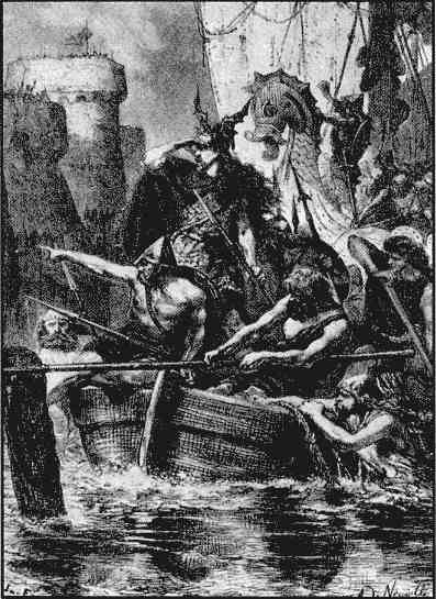Действительно, пираты, нападавшие на британские берега, были выходцами с севера — из Скандинавии. Их нападения застали врасплох население Западной Европы. Завидев корабли под полосатыми или красными парусами с головами драконов и зверей на высоко вздымавшихся форштевнях, жители приморских районов Англии и Ирландии, Франции и Германии бросали дома и поля и спешили укрыться в лесах вместе со своим домашним скарбом и скотом. Замешкавшиеся погибали под ударами боевых топоров пришельцев или становились их пленниками. Вместе с награбленным имуществом их грузили на корабли и увозили на север. Все, что пираты не могли захватить с собой, уничтожалось: скот убивали, дома сжигали. Попытки оказать им сопротивление поначалу были безуспешны. Хорошо вооруженные бесстрашные северные воины, охваченные жаждой добычи и возглавляемые прославленными вождями, легко рассеивали неорганизованные толпы крестьян, отвыкших от военного дела и приученных обращаться скорее с плугом и граблями, чем с мечом и копьем. Постоянно враждовавшие между собой феодалы Западной Европы не могли объединиться для того, чтобы дать отпор дерзким грабителям. Ошеломленные жители стран, подвергавшихся нападениям норманнов — «северных людей», как их прозвали за Западе, долгое время оставались беззащитными перед этой угрозой и, подобно Алкуину, видели в ней Божью кару за грехи. Духовенство молилось: «Боже, избави нас от неистовства норманнов!» Но самые горячие мольбы ко Всевышнему, на которого в средние века неизменно возлагались надежды о спасении от всяческих напастей, не помогали. Именно к этому времени относится предсказание, приписываемое Карлу Великому, что северные пираты причинят великие бедствия последующим поколениям.