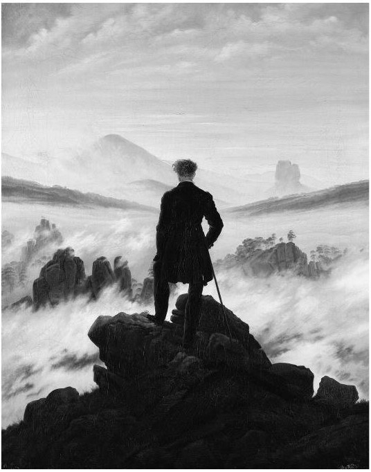 Романтически одетый мужчина в романтическом пейзаже. Немецкий герой перед лицом туманной неизвестности, его костюм одновременно облекает его в броню и обнажает перед встречей с роком.
