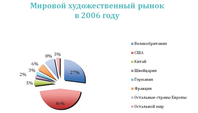 Исследователи международного центра «Artprice» отмечают, что мировой арт-рынок начал заметно расти с 2003 г., а 2006 стал годом резкого подъема по количеству продаж, общему объему и среднему ценовому показателю. Если в 2002 г. общий оборот мирового арт-рынка составлял €26,7 млрд[119], то в 2006-м г. эта сумма выросла до €43,3 млрд[120]. В 2002–2006 гг. продажи на арт-рынке выросли на 95 % от оборота в стоимостном выражении и на 24 % по количеству сделок[121].