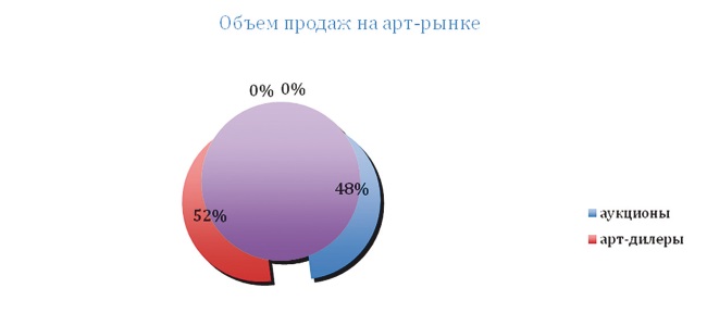 Весь объем продаж разделили между собой два больших сектора арт-рынка: аукционы (их доля составила 48 %) и артдилеры (52 %).