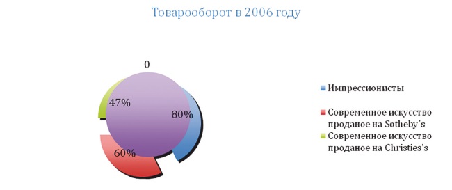 Для мировых лидеров 2006 г. стал во многом переломным. Объем продаж Sotheby’s составил €2,8 млрд[125], его главного конкурента Christie’s – €3,6 млрд[126]. В 2006 г. товарооборот импрессионистов у обоих аукционных домов вырос на 80 %, современного искусства – на 60 % на Sotheby’s и на 47 % на Christie’s[127].