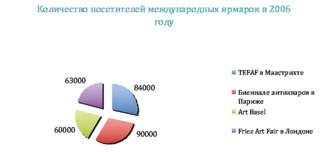 Значительной частью арт-рынка за последние несколько лет стали международные ярмарки изящных искусств, которые создают благоприятные условия взаимного поиска как для продавцов, так и для покупателей предметов искусства. Это обеспечивается большим потоком посетителей: так, в 2006 г. TEFAF в Маастрихте посетило 84 тыс. человек.[151], Биеннале антикваров в Париже – 90 тыс., Art Basel – 60 тыс., Friez Art Fair в Лондоне – 63 тыс[152]. По опросу участников TEFAF, около 40 % их последующих сделок в году напрямую связаны с участием в различных ярмарках[153].
