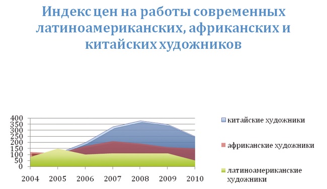 Однако на протяжении всего 2009 г. падение темпов продаж по разным странам продолжается. Особняком здесь стоит только рост цен на современное китайское искусство. Объем продаж в 2009 г. составил €550 млн. Вверх идут современные латиноамериканские и африканские художники.