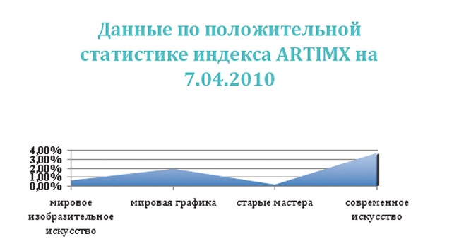 Например, по данным на 7 апреля 2010 г., показатель по мировому изобразительному искусству вырос на 0,63 %[199], мировая графика выросла на 1,95 %[200], показатели по старым мастерам повысились на 0,2 %, а вот индекс по современному искусству поднялся на 3,76 %[201].