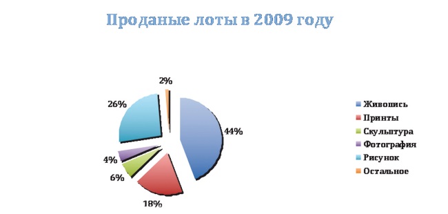 Интересным представляется качественная характеристика продаж в 2009 г. По данным аукционных продаж в мире, от общего оборота произведений искусства снизились продажи в категориях живописи и скульптуры, увеличились покупки произведений в категориях принтов, фотографии, рисунка. Это связано с тем, что сама привычка коллекционировать остается, но финансовые средства расходуются на более бюджетные вещи. Как это было описано в первой части данной работы, коллекционеры обратили свое внимание на прежде менее значимые произведения: акварель, графику, фотографию, рисунок. Их цена всегда ниже произведений масляной живописи и скульптуры. С другой стороны, важным является и то, что коллекционировать эти позиции стали и молодые коллекционеры по причине «доступности» покупки таких произведений искусства.