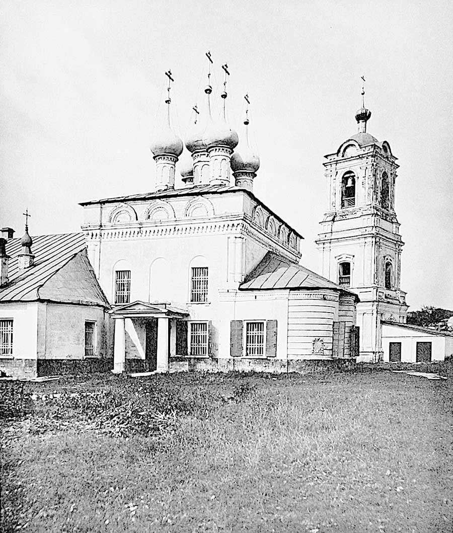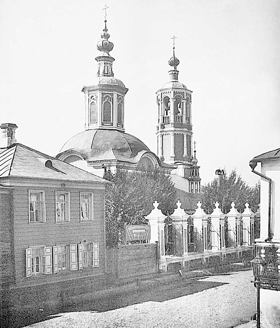 Позднее здесь была деревянная приходская церковь, замененная каменной в 1682 г., когда выдали грамоту о построении ее «прихожанами надворныя пехоты Васильевского полка Пушешникова пятидесятникам, десятникам и рядовыми». Церковь – четверик с тесно поставленным пятиглавием, к которому в XVIII в. построили грузную колокольню, а в 1903 г. широкую трапезную с приделами по проекту архитектора З. И. Иванова, – находилась на нынешней площадке между домами № 36 и 38. Колокольню снесли в 1937 г., а самую церковь – двумя годами позже.
